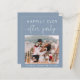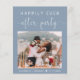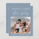Elemento azul empoeirado e empoeirado / anúncio privado de casamento e convite de recepção apresentando sua foto, "Felizmente, nunca depois da festa" em uma simples tipografia branca e um roteiro branco chique com balsas e seus nomes e data de casamento. No verso, insira o endereço de URL do seu site de casamento para criar um código QR para os convidados pesquisarem todos os detalhes e para RSVP online, personalizem seus detalhes de lançamento e recepção e adicionem seus nomes em um script branco tipo assinatura.