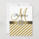 Convite à Recepção de casamento Monograma Dourado e Branco com um padrão de faixas diagonais e uma fita de cetim de ouro impressa e um broche de diamante quadrado IMPRESSO num design de placa plana quadrada. Design de layout por Elke Clarke ©2012. Gráficos licenciados. Personalize com seus nomes de monograma e texto de convite de recepção de casamento usando os prompts ou selecione "personalizá-lo" para obter mais opções de edição. As noivas adoram os convites embelezados com joias e fitas até chegarem ao escritório de posto e perceberem que os convites custarão muito mais para enviar aos seus convidados. Estes convites e acessórios de pacotes de casamento têm a foto da fita de satin e o broche de diamante IMPRESSO na placa plana. Você acaba com o efeito elegante sem o custo extra e o trabalho de montar seus convites. Entre em contato com luxuryweddinginvitations@gmail.com para obter outras cores ou ajuda com o seu design ou com os itens correspondentes que você precisar.