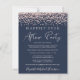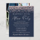 Marinho azul escura e amigável, ou anúncio privado de casamento e convite para recepções de casamento. A frente apresenta o confete de brilho rosa dourado e "Felizmente, nunca depois da festa" em uma mistura de tipografia rosa de ouro leve e um roteiro chic, moderno de ouro rosa. Personalize seu anúncio e convite e adicione seus nomes em um script semelhante a assinatura. O verso mostra sua foto de casamento, seus nomes e a data do casamento.