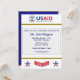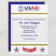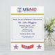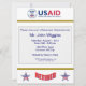 Este convite azul e dourado é decorado com o logotipo da Agência de Desenvolvimento Internacional dos Estados Unidos (USAID). O verso é decorado com o logotipo USAID e a palavra "Aposentado".