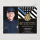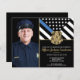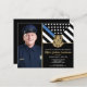 Este design apresenta uma bandeira da polícia com listras pretas e brancas, e uma fina faixa azul de linha também. O crachá da polícia e o texto do ouro estão acima de todos os detalhes do partido para os detalhes do polícia aposentado, xerife, capitão ou chefe do partido aposentado. Personalize ainda mais esta design com a foto do policial aposentado.