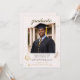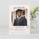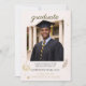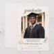 Tema de retrato acadêmico com sotaques quentes dourados em um fundo suave creme, apresentando uma foto centralizada do graduado emoldurada por detalhes sutis de confetes e pequenos ícones acadêmicos. Tipografia cursiva e serifa combinam com um layout limpo adequado para anúncios de formatura universitária e reuniões de celebração no campus.