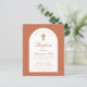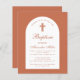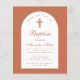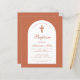 Um convite batismo para o batizado de um menino. Numa cor moderna, teracotta marrom, tem uma arca branca com terra cotta text dentro. A palavra Batismo e o nome são escritos num guião caligráfico elegante; a primeira linha é o texto arquivado.
