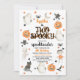 Convite de aniversário de Halloween para crianças com abóbora, estrelas, fantasma, aranha, gato, morcego em design de fundo branco.