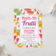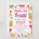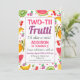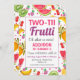Um belo convite de aniversário de duas vezes por frutti para uma menina com várias frutas e um quadro branco com uma borda roxa. Este belo convite define a cena de uma fruta colorida com tema de segunda festa de aniversário.
