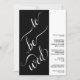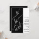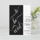 Este convite para o casamento tem um estilo moderno minimalista com dois painéis, um preto, o outro branco. O painel da esquerda é preto e tem uma elegante caligrafia de script, que lê "to be wing". O painel da direita é branco, com um simples texto preto, com todas as informações detalhadas. Único, artístico e bonito.