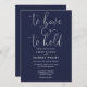 Este convite para casamento de guião elegante minimalista azul marinho pode ser personalizado com as suas informações em tipografia quic com os detalhes do seu website de casamento e o seu código QR no verso. Projetado por Thisnotme©
