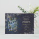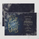Convite Horizontal para uma Noite Sob as Estrelas com tipografia elegante e escrita à mão de “Uma Noite Sob as Estrelas”. Este design inclui elementos de azul escuro, dourado e um fundo de noite estrelada. Inclui um modelo para personalização.