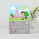 Este convite bonito e divertido mostra uma cabeleira vermelha com um poodle. Ao fundo está a Torre Eiffel, a luz do sol, as nuvens e as árvores. Há um posto de sinais e uma mesa com cadeiras para ajustado do tema Paris. O texto combina fontes decorativas e serif para um aspecto na moda e moderno. Isto é perfeito para uma festa de aniversário temática em Paris.