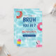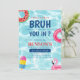 Legal Bruh Blue Piscina Party Boys Aniversário. Design apresenta um simples fundo branco, com o título 'BRUH. Comida, natação, bolo, Você em?', O modelo de fontes moderno sans é muito fácil de personalizar usando o modelo fornecido. Convidado perfeito para meninos de todas as idades!