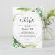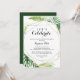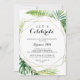 Este convite de festas de celebração de vamos de destino geométrico é perfeito para uma festa de noivado tropical, festa de solteira, aposentadoria, graduação, casamento após festa ou qualquer evento ou festa. O design apresenta palma verde-aquarela pintada à mão e folhas de bananeira bem organizadas em belos buquês, enfeitando um quadro geométrico dourado.