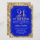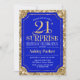 Convite de celebração de aniversário de 21 anos surpresa. Design elegante em azul real e padrão de ouro brilhante. Apresenta uma fonte elegante de script. Envie-me uma mensagem se precisar de mais personalização.