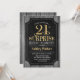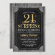 Convite à Celebração de aniversário de 21 anos de Surpresa Russa. Design elegante em preto, ouro falso brilhante e padrão de madeira de cinza. Apresenta uma fonte elegante de script. Envie-me uma mensagem se precisar de mais personalização.