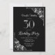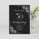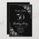 Um convite de festas aniversário de 30 anos preto e branco com cantos diagonais de rendas do ornamentado para enquadrar o texto branco.