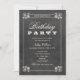 Convite de aniversário simples, romântico e chic apresenta uma borda riscada, esboços desenhados à mão de flores e elegante tipografia de estilo vintage. Fundo de estilo de quadro-negro suave com aparência texturizada rústica e cores de giz branco/marfim macio.
