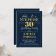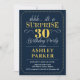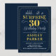 Convite de festas de aniversário de 30 anos surpresa. Design simples em marinho azul e amarelo. Apresenta uma fonte elegante de script. Celebração surpresa para homem ou mulher. Pode ser personalizado em qualquer idade!