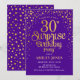 Convite de festas de aniversário de 30 anos surpresa. Design elegante em roxo real e ouro brilhante. Possui fonte de script na moda e confetti. Envie-me uma mensagem se precisar de idade personalizada.