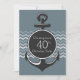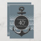 Um convite temido náutico para um Partido aniversário de 40 anos - perfeito para a pessoa que ama a vida nos mares. O design apresenta uma grande âncora na parte frontal com texto personalizável para a ocasião, incluindo sua idade que pode ser alterada para qualquer idade. Ele é apresentado em uma cinza azul de fundo com um sotaque padrão chevron zigzag. A parte de trás do convite apresenta o sotaque de chevron como uma borda no topo e na parte de baixo do design com texto personalizável para esta celebração de marco. Se você quiser que este design seja de uma cor diferente, entre em contato com a nossa loja CelebrationBazaar e ficaremos felizes em ajudar com sua solicitação.