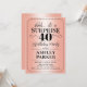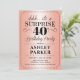 Convite de festas de aniversário de 40 anos surpresa. Design simples em ouro rosa e preto. Apresentando um padrão de folha de rosa dourado falso e uma letra de script elegante. Celebração surpresa para homem ou mulher. Pode ser personalizado em qualquer idade!