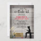 Convite à aniversário de criança russo, com fundo de madeira, uma silhueta de um menino sentado sobre uma pesca de píer, patos, duas libélulas, um cartaz de madeira postado com as palavras 'Foi pescar' e um modelo de aniversário fácil de personalizar.