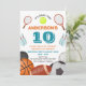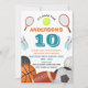 Celebre o dia especial do seu atleta com este divertido e colorido convite de aniversário com tema desportivo! Com raquetes de tênis, basquetebol, bola de futebol, beisebol e muito mais, este design lúdico do "Game Time" é perfeito para qualquer criança que ama esporte. Personalize com o nome, a idade, os detalhes do partido e as informações de RSVP. Uma escolha de excelente para rapazes ou raparigas que adoram esportes e que querem uma comemoração de aniversário enérgica e divertida.