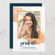 Anúncio de graduação em chic e convite de festas de formando com cor d'água laranja com pequenas lâminas de folha de ouro falsas e borda de folha de ouro falso em torno da foto. O convite tem um lado azul nas costas. Personalize-o substituindo o texto do marcador de posição e substitua a foto do marcador de amostra/marcador de posição por sua própria foto. Para obter mais opções, como alterar a fonte e seu tamanho/cor ou o espaçamento entre letras, clique no botão "Personalizar". *Observe que a Marca d'água do Zazzle que aparece na visualização de zoom NÃO aparecerá no produto impresso final. © Rosewood e Citrus