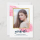 Anúncio de graduação em chic e convite de festas de formando com aquarela cor-de-rosa com pequenas lâminas de folha de ouro falsas e borda de folha de ouro falso em torno da foto. O convite tem um lado azul nas costas. Personalize-o substituindo o texto do marcador de posição e substitua a foto do marcador de amostra/marcador de posição por sua própria foto. Para obter mais opções, como alterar a fonte e seu tamanho/cor ou o espaçamento entre letras, clique no botão "Personalizar". *Observe que a Marca d'água do Zazzle que aparece na visualização de zoom NÃO aparecerá no produto impresso final. © Rosewood e Citrus