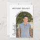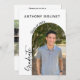 Um cartão de convite à Festa de formatura de fotos do Formando de Script Moderno apresenta uma fonte moderna de script com uma imagem mascarada na frente e uma foto de retrato sangrado pelo cheio no verso, juntamente com o nome e os detalhes da festa. Se você está procurando por algo feito por medida, eu adoraria criar um design personalizado para você. Envie-me um e-mail para susan@susannewberrydesigns.com.