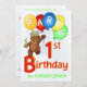 Um convite de festas do primeiro aniversario do divertimento com o nome da sua criança que caracteriza um príncipe de um urso de ursinho toda decked para fora em uma coroa jeweled colorida que guardara um grupo do balão colorido com letras nelas que o período para fora PARTY. Personalizar com nome da sua criança fá-lo extremamente especial. Toda a informação do partido pode ser personalizada usando o modelo fornecido. Nós especializamo-nos no design feito-à-medida, assim que contacte-nos se você gostaria de uma disposição feito sob medida original usando este design real básico do urso de ursinho para a celebração memorável do aniversário do seu miúdo.