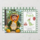 Festa de aniversário de criança de Aquarela. Watercolor Dino no chapéu de aniversário, bolo com velas, balão vermelho. Fundo de gaiola verde.