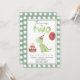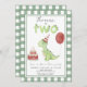 Festa de aniversário de criança de Aquarela. Watercolor Dino no chapéu de aniversário, bolo com velas, balão vermelho. Fundo de gaiola verde.