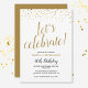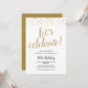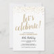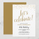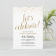 Perfeito para um próximo aniversário, este convite pode ser personalizado para qualquer idade. Num fundo branco, há pequenos corações reluzentes de ouro no topo, debaixo da elegante tipografia de ouro que diz "celebração do vamos!". Por baixo, em mistura de tipografia negra e dourada, você pode facilmente personalizar com seu nome, detalhes de festas e a idade que está sendo celebrada. O fundo do convite tem um fundo de ouro.