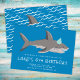 Este convite de festas aniversário de criança divertido apresenta uma ilustração de tubarão com um fundo azul ousado e fontes casuais e aflitos. É uma escolha excelente para uma festa de aniversário de rapazes. Consulte a coleção para coordenar itens!