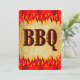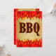 Um convite personalizado de festa de aniversário ou CHURRASCO com arte de chamas vermelhas e laranja lendo CHURRASCO na frente e na sala para texto personalizado em letras estilo ocidental no verso. Personalize-o para alterar as fontes, o tamanho do convite, as cores de fundo, adicionar ou remover texto e muito mais, e até salvar seu design para mais tarde.