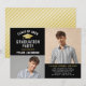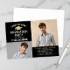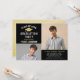 Anuncie seu formando de estilo com este convite de festa de formatura moderno, mas elegante. Design apresenta um fundo preto com dois espaços para fotos de mais velho, texto em ouro e branco que pode ser personalizado com as informações do formando e detalhes da festa, e um simples padrão de faixas diagonais brancas na parte traseira da placa. As cores do texto e do plano de fundo podem ser personalizadas.