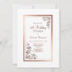 Um elegante convite de festas ouro/cobre revestido de aniversário de 40 anos floral com um rosa de ouro quente com ornamentação floral em ouro quente nos cantos diagonais e texto entrelaçado.