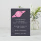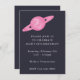 Planejar uma festa com tema espacial? Este convite minimalista moderno pode ser exatamente o que se procura. Ele apresenta uma ilustração de uma aquarela fofinha de Saturno em rosa sobre um fundo azul escuro de marinho (a cor de fundo pode ser alterada) com os detalhes de sua festa.