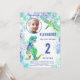 Uma festa de aniversário de dinossauros segundo azul e verde colorida divertida, azul e verde, para a criança que ama dinossauros. Colorida Rex e convite de aniversário pterodátilo Jurássico voador para fãs Dino por uma divertida segunda festa de aniversário. Personalize este psicodélico pré-histórico Tyrannosaurus rex e pterodactyl design com uma fotografia, o número de anos e os detalhes da festa na divertida tipografia moderna e vocês estão prontos para uma festa de aniversário temática de dinossauro excelente. Todas as espécies de dinossauros são bem-vindas. Ilustração original de arte por Catherine Sweetman