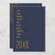 Se você está planejando uma sofisticada reunião de Ano Novo, esses convites minimalistas certamente impressionarão seus convidados! A frente apresenta um fundo azul e texto dourado contando até o ano novo em um design ousado centrado na tipografia. O verso é impresso com um layout estilizadamente assimétrico baseado em texto com uma intermitência de fogos de artifício em um canto. Todos na sua festa vão beber um brinde a estes convites quentes e modernos!