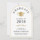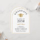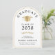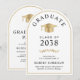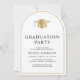 Convite de festas em forma de arco branco formado por um boné de formando de ouro e o nome do formando, ano de aula, faculdade ou universidade, grau e notoriedade ou honra em tipografia sorifônica elegante. Adicione os detalhes da sua festa no verso.