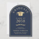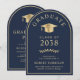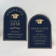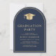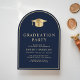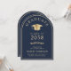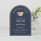 Anúncio de formandos azul em forma de arco elegante e convite de festas apresentando um boné de formando de ouro e uma tipografia clássica de serifpografia de ouro para o nome do formando, ano de aula, faculdade ou universidade, grau e grande ou honras. No verso, adicione os detalhes da sua festa.