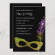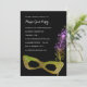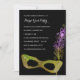 Este convite de festas chamativo do carnaval caracteriza uma máscara verde-amarela pintada na aguarela e coberta nas gemas de prata do falso, uma pena roxa bonito, e um fundo preto chique. Aperfeiçoe para um tema do mascarada! O texto adicional ou as fotos podem ser adicionados à parte traseira do cartão se necessário.