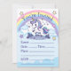O Partido Unicórnio convida para qualquer ocasião. Um belo desenho desenhado de unicórnio. Ela tem uma mana e uma cauda coloridas em azul pastel, pinks e roxas, um chifre amarelo na coroa de sua cabeça, um corpo branco e cascos roxos. Ela está sobre a grama roxa com arbustos roxos no fundo e cercada por estrelas coloridas, um belo arco-íris e nuvens lisas. Use o convite como está ou substitua o texto em qualquer modelo.