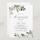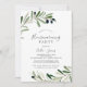 Este moderno convite de festas de limpeza de casa do ramo é perfeito para um evento bô. O design rústico, porém elegante, apresenta folhas botânicas de cor aquática simples e azeitonas pretas num pequeno galho com um toque mediterrânico clássico.