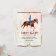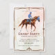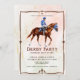 Convite de festas da Corrida Moderna de Cavalo Derby com uma ilustração de um cavalo de corrida com jóquei e padrão listrado nas costas. Todos os elementos de texto podem ser alterados para que este design possa ser usado para outros eventos também: convite para casamento equestre clássico, festa de aniversário de cavalo, festa de relógio derby, abertura de celeiro de cavalo e muito mais. Fundo, cor da ilustração e cores do texto podem ser alteradas com a ferramenta design!