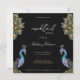 Com as suas penas brilhantes e a magnífica plumagem, este elegante pavão representa força e confiança com o perfeito equilíbrio de delicada mas marcante compostura. Convide convidados para o seu Partido Cocktail com este convite elegante e formal e elegante para o pavão! Completamente personalizável! Artesanato original pintado à mão em aquarela.
