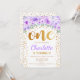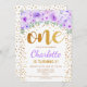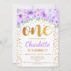 Primeira Convite de aniversário. Design elegante em ouro brilhante com acento floral e verde. Convide cartão com brilho "Um" na fonte do script com confetti. Púrpura, branca e verde-menta. Perfeito para uma festa de na moda 1rua.