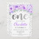 Primeira Convite de aniversário. Design elegante em prata brilhante com verde e sotaque floral. Convide cartão com brilho "Um" na fonte do script com confetti. Púrpura, branca e verde-menta. Perfeito para uma festa de na moda 1rua.