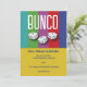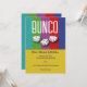 Retro cores divertidas e coloridas convite para Bunco. Tipografia moderna com três dados sortudos do Bunco. Convide os jogadores para uma noite divertida de dados, jantas e bebidas. Continua a rolar!