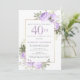 Honre uma mulher especial com este convite de festas aniversário de 40 anos de surpresa elegante e feminina. O 40º está escrito em grande texto roxo. O Partido da Surpresa de Aniversário segue. O nome do convidado é também em letras de maiúsculas roxas. O resto do texto é cinza de pomba mole. Os detalhes da celebração do aniversário de 40 anos estão cercados por uma moldura de ouro chico que é decorada com rosas roxas e folhas verdes sábias. Enquanto é um design tradicional, a folhagem botânica aberta e arejada e o texto lhe dão uma vibração contemporânea. O convite de volta é um roxo suave. Infelizmente, os 40 algarismos não são editáveis. Se precisares de mais um ano, terei todo o prazer em fazer um design personalizado para ti.